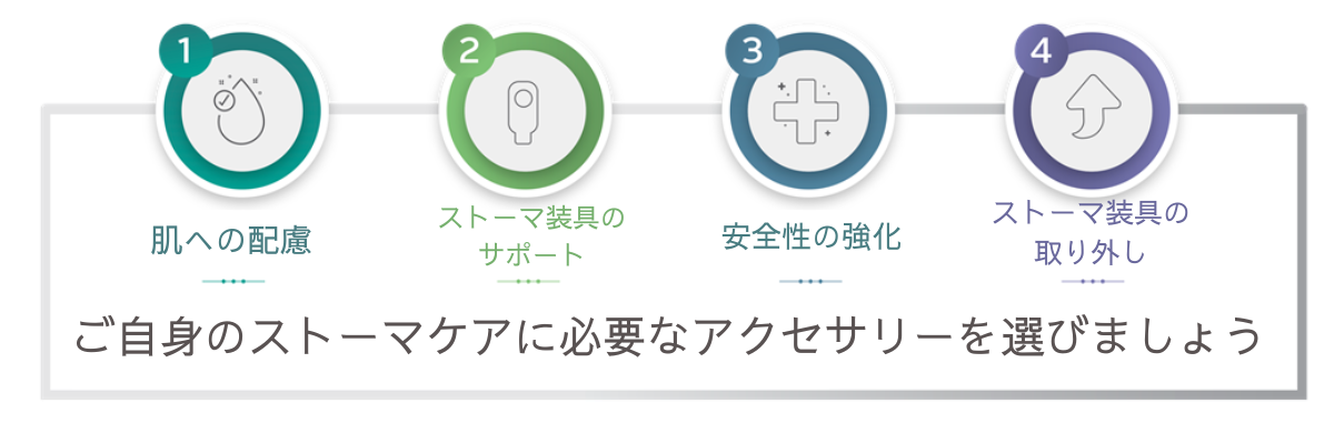 耐久性のある皮膚保護をお望みの場合でも、ストーマ装具の安全性を強化する場合でも、適切なアクセサリーを組み合わせることで、より快適で安心なストーマ装具の装着が可能になります。